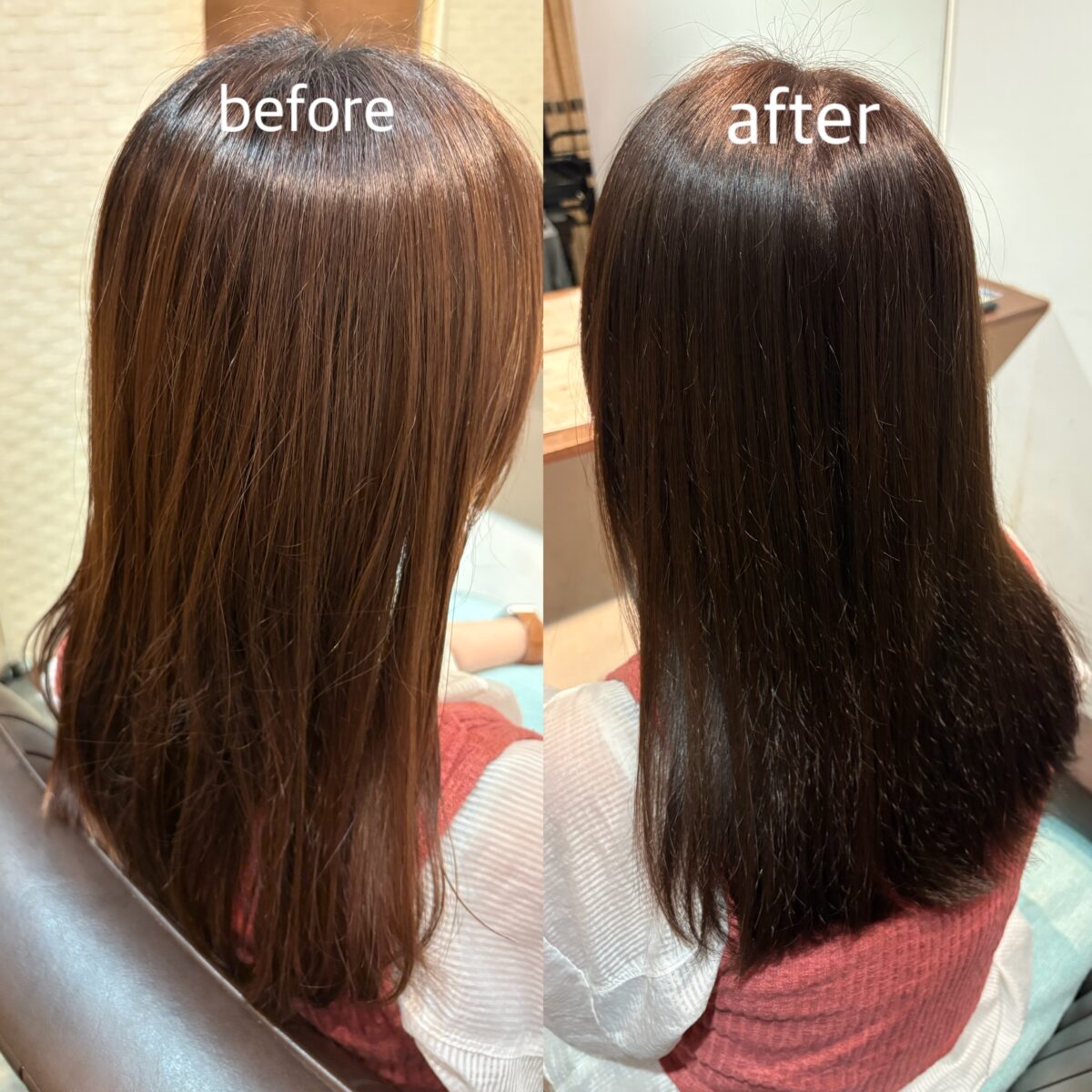 beforeは、明るくなってちょっとオレンジっぽさが出てる状態。パサっと見えやすいのが気になるポイント(._.)
